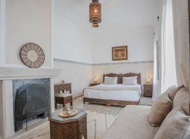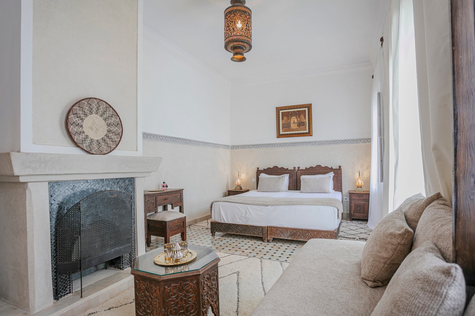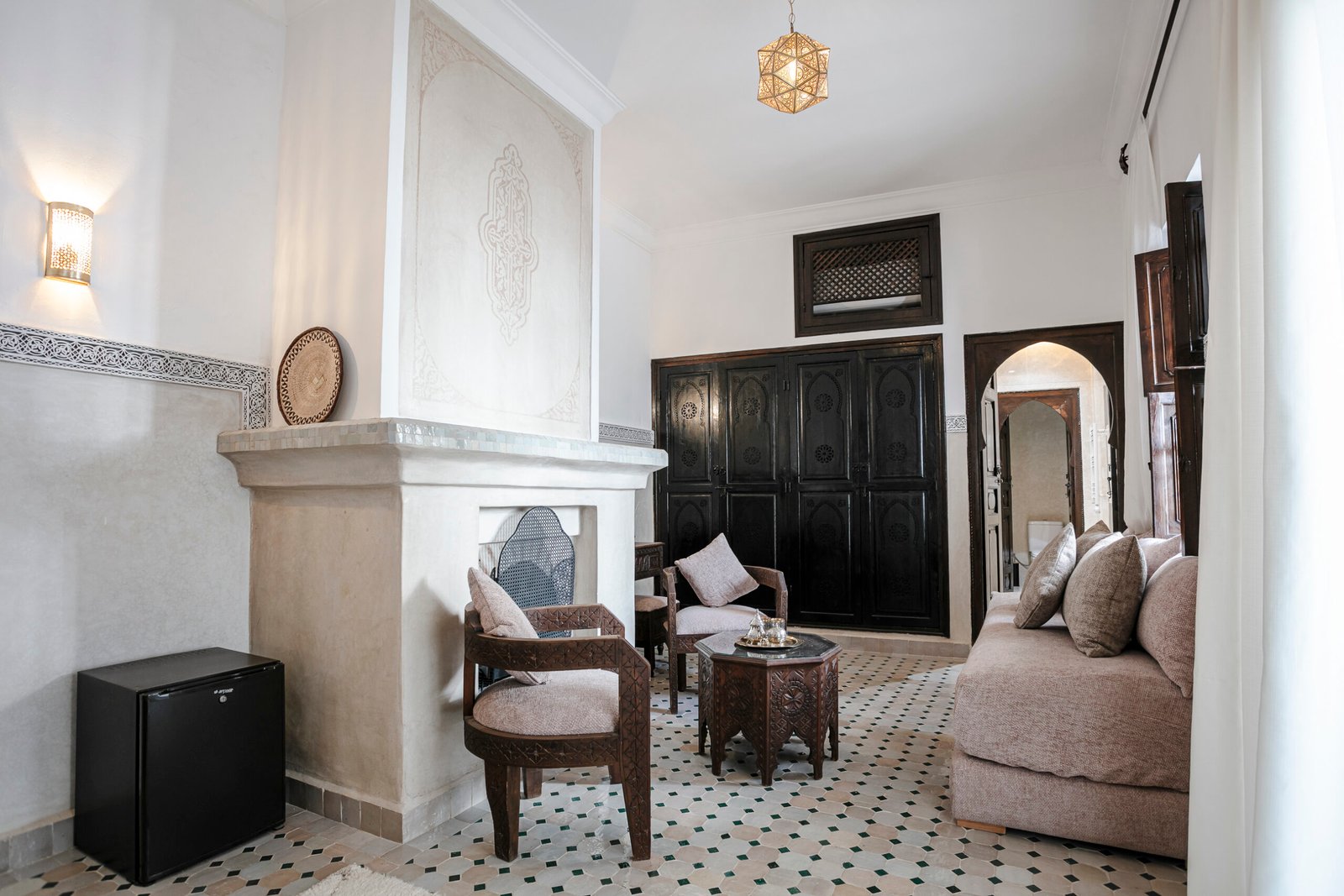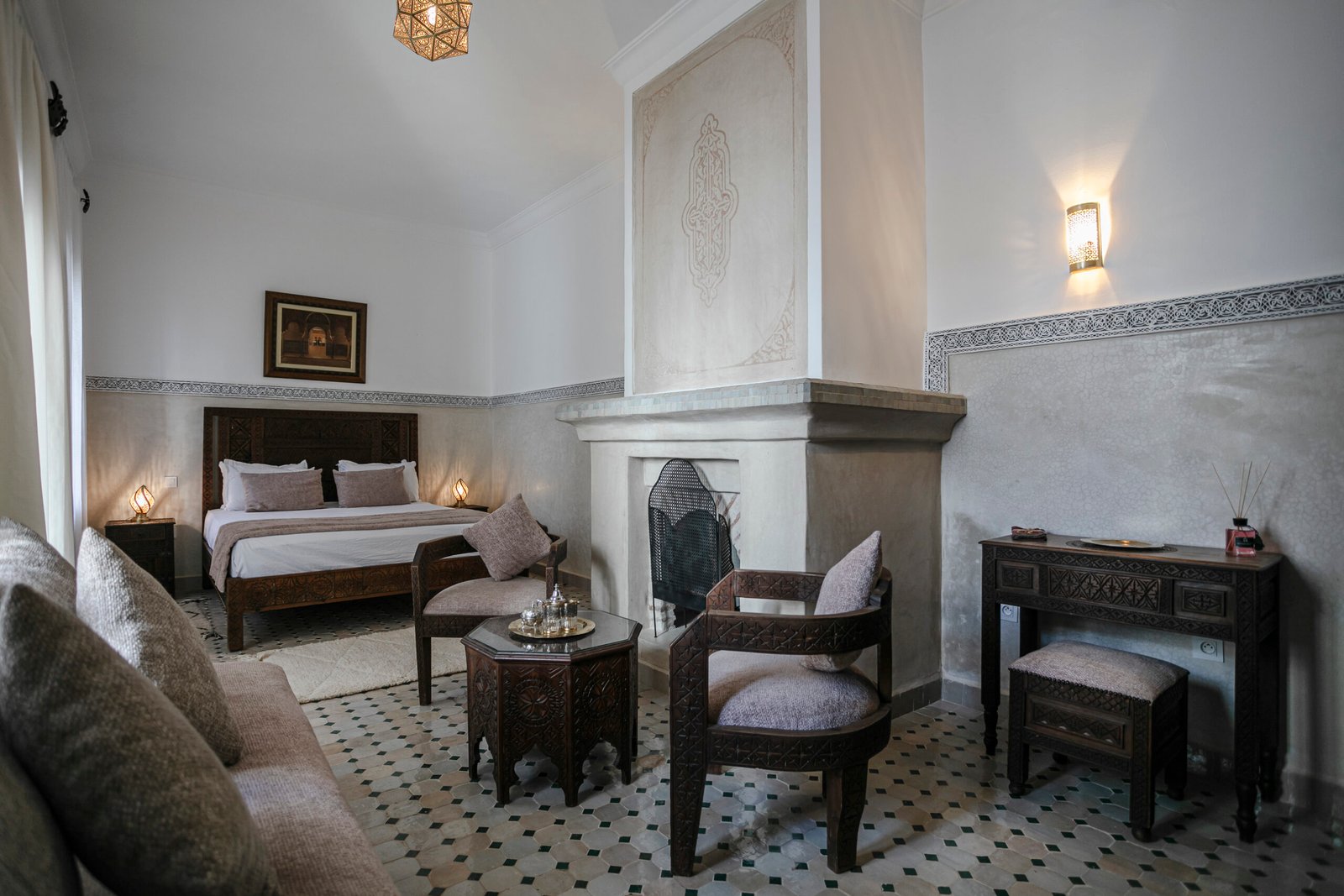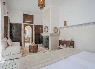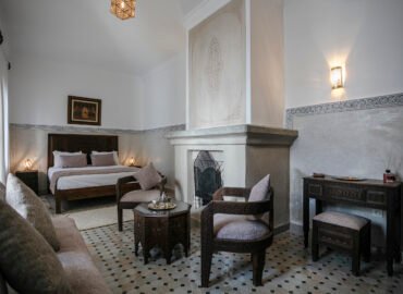 Un coin salon agrémenté d’une cheminée invite à savourer un moment de calme, loin de toute distraction moderne — fidèles à l’esprit du riad, les suites ne sont pas équipées de télévision, afin de préserver le silence et la sérénité du lieu. Les salles de bain, décorées avec soin dans un style traditionnel marocain, associent zellige et marbre pour offrir une expérience de bien-être empreinte d’authenticité. Spacieuses et lumineuses, les Suites Junior accueillent confortablement deux à trois personnes, idéales pour les couples en quête de romantisme ou les petites familles désireuses de profiter d’un séjour paisible au cœur de la médina.