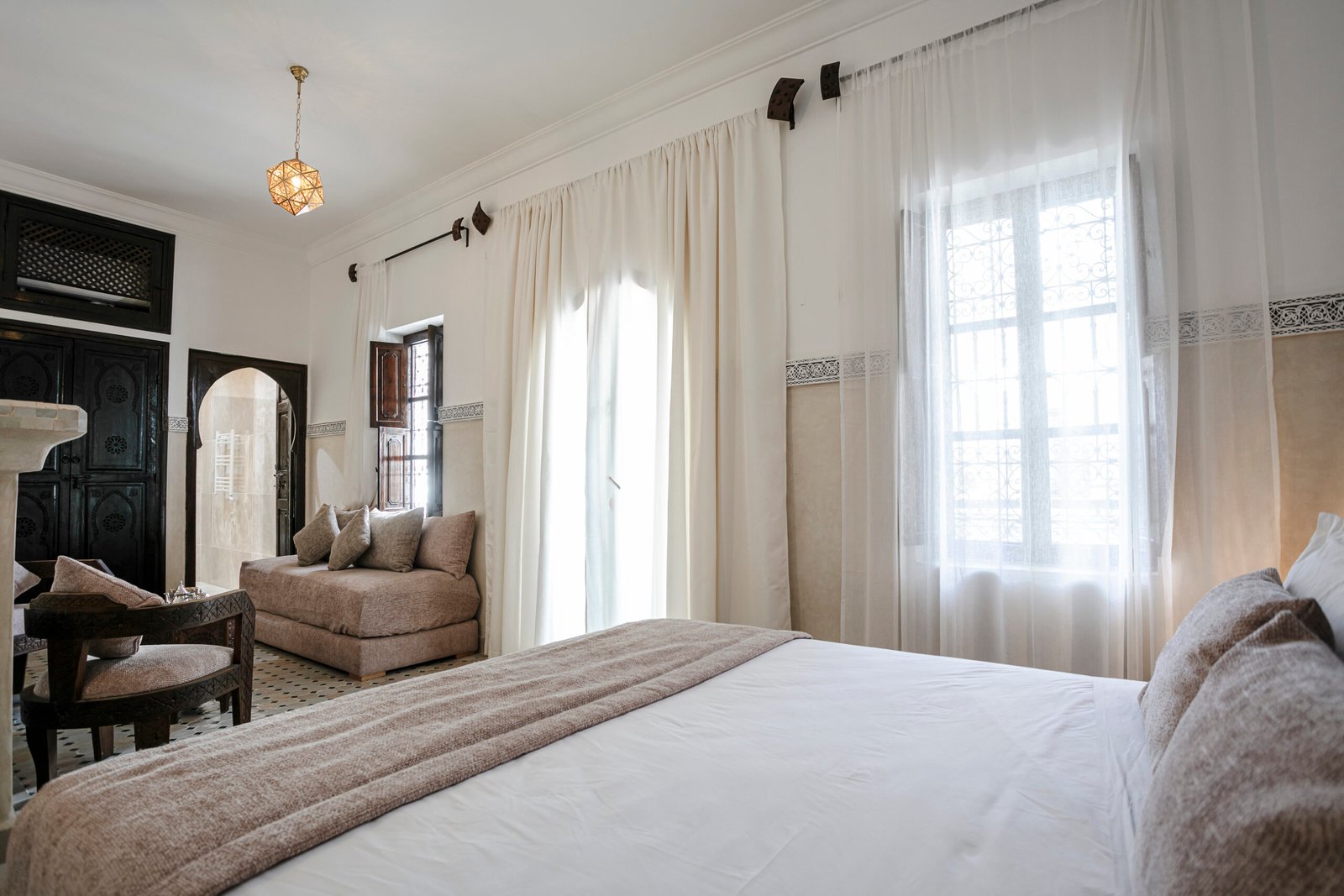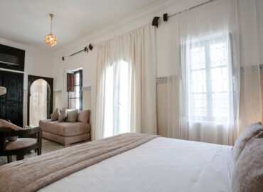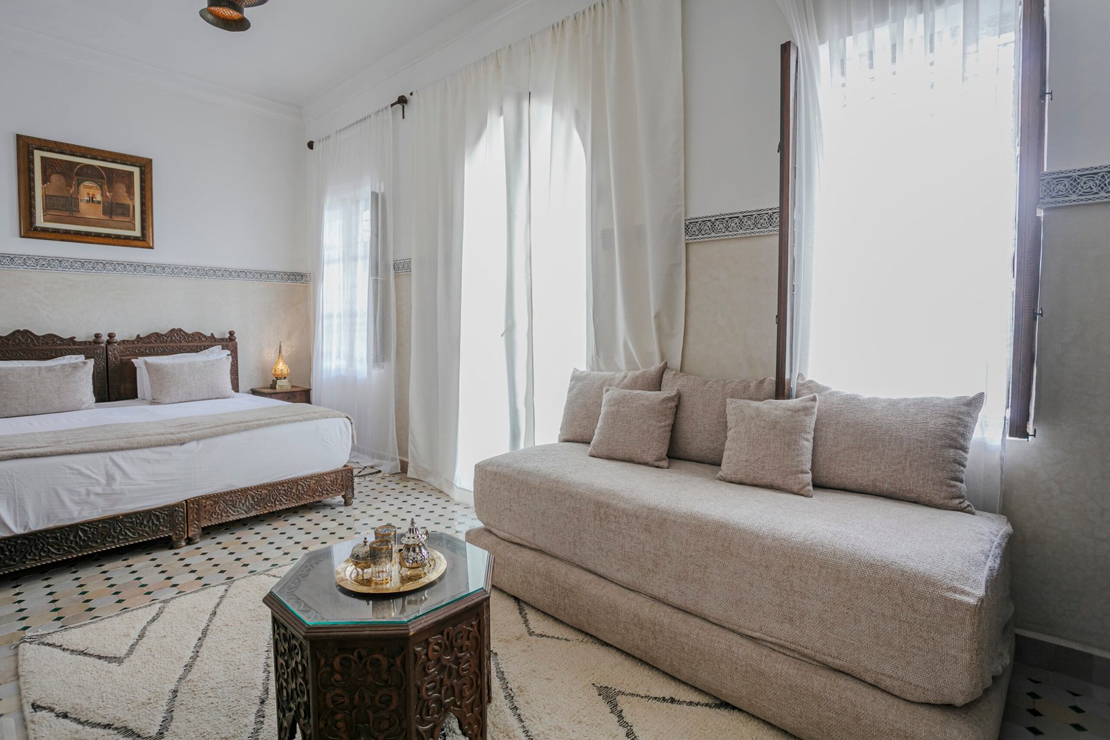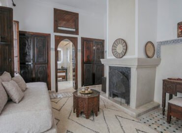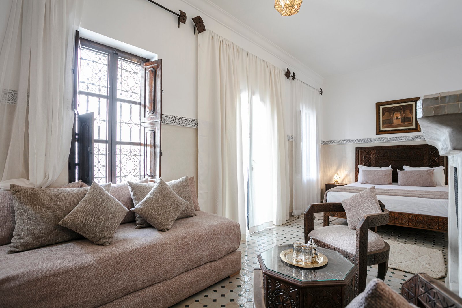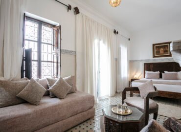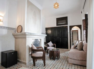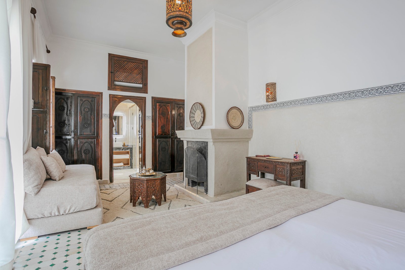 Un coin salon agrémenté d’une cheminée invite à savourer un moment de calme, loin de toute distraction moderne — fidèles à l’esprit du riad, les suites ne sont pas équipées de télévision, afin de préserver le silence et la sérénité du lieu. Les salles de bain, décorées avec soin dans un style traditionnel marocain, associent zellige et marbre pour offrir une expérience de bien-être empreinte d’authenticité. Spacieuses et lumineuses, les Suites Junior accueillent confortablement deux à trois personnes, idéales pour les couples en quête de romantisme ou les petites familles désireuses de profiter d’un séjour paisible au cœur de la médina.