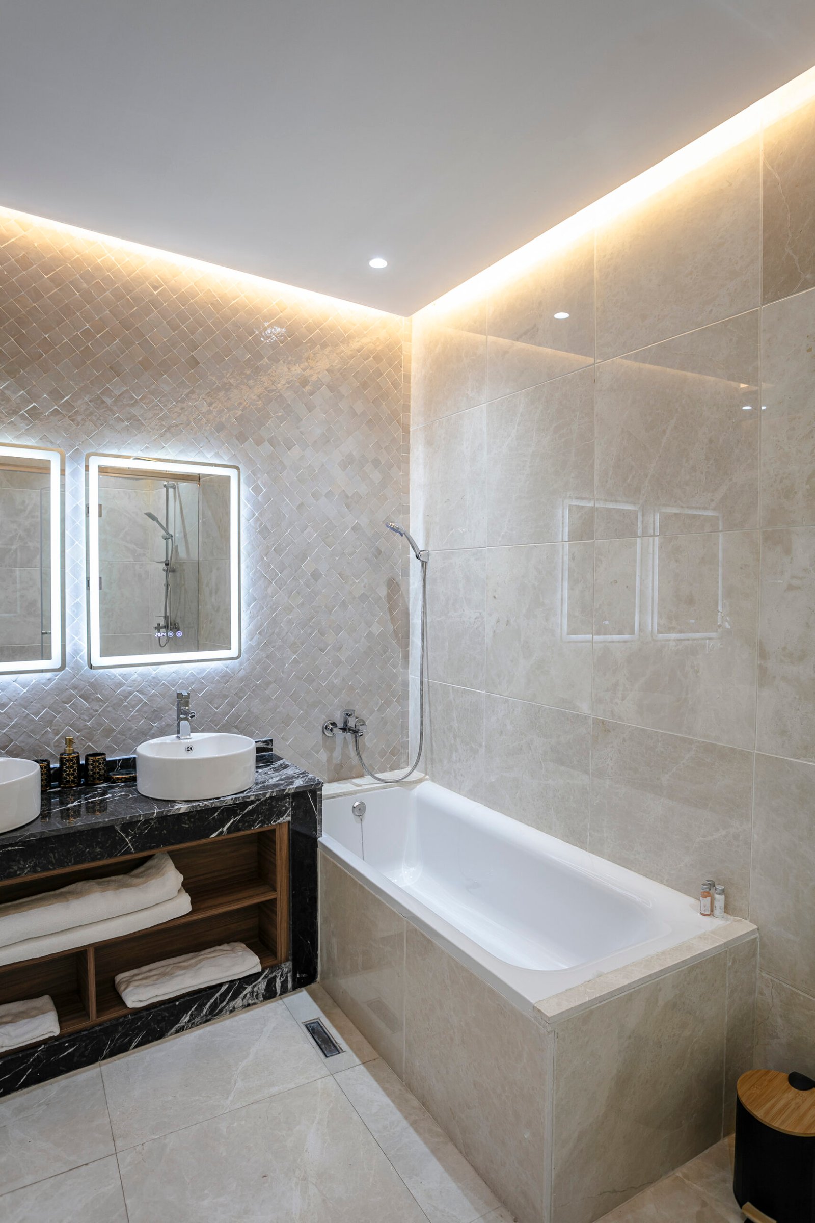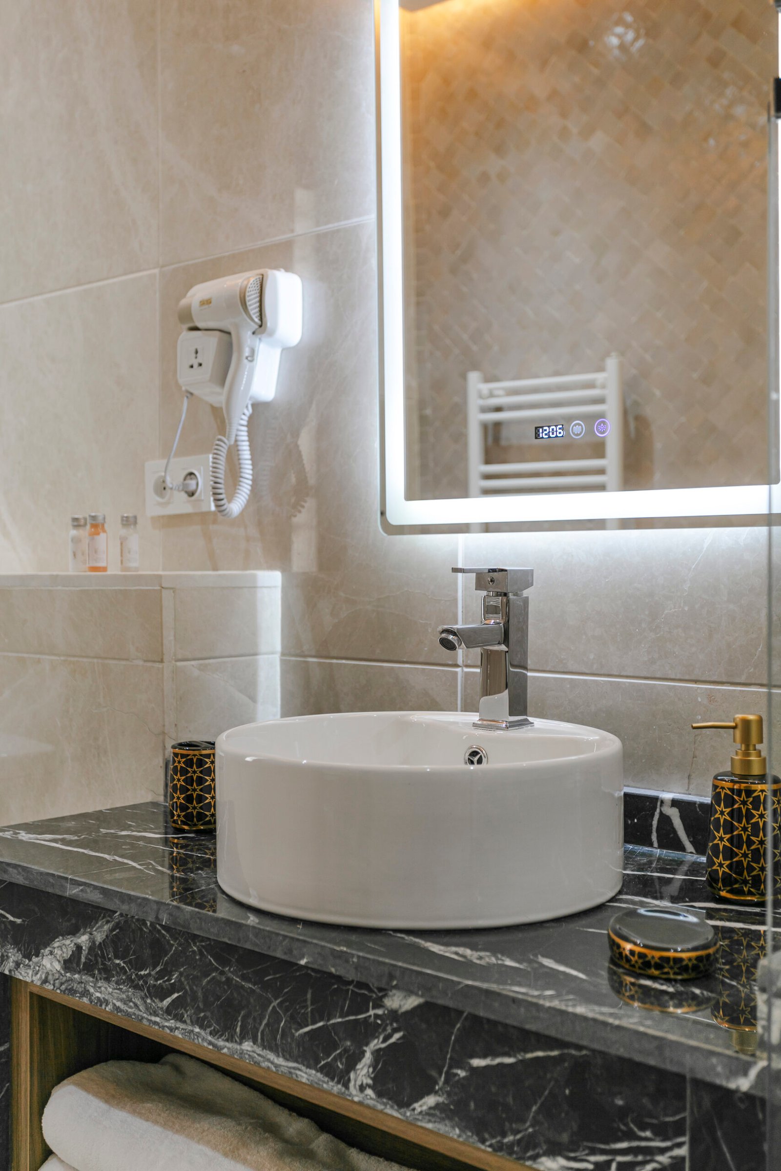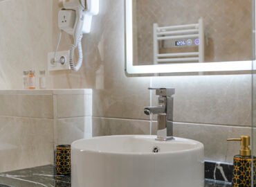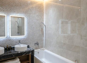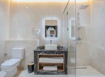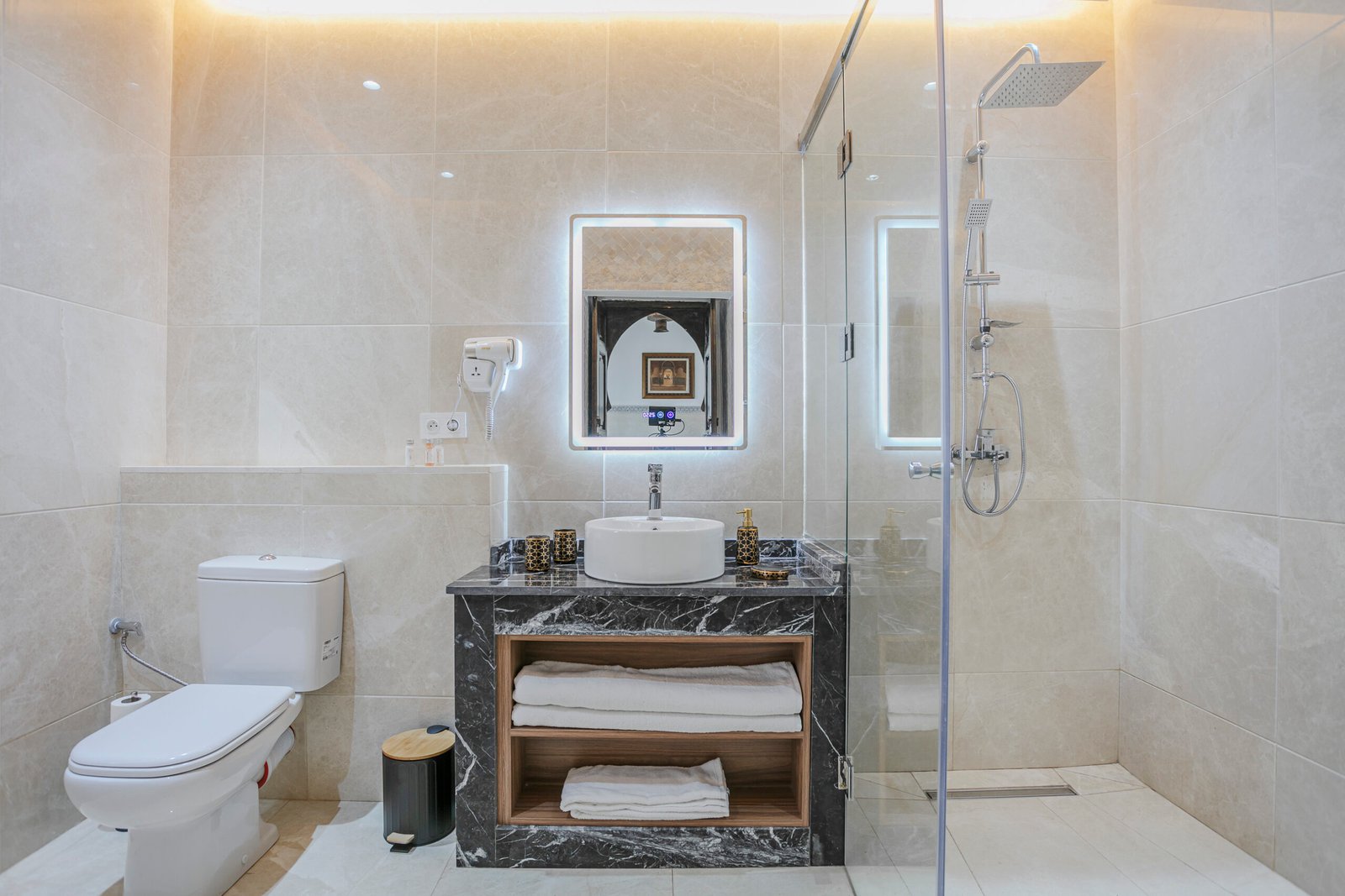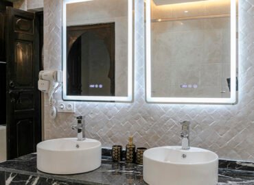 Un coin salon agrémenté d’une cheminée invite à savourer un moment de calme, loin de toute distraction moderne — fidèles à l’esprit du riad, les suites ne sont pas équipées de télévision, afin de préserver le silence et la sérénité du lieu. Les salles de bain, décorées avec soin dans un style traditionnel marocain, associent zellige et marbre pour offrir une expérience de bien-être empreinte d’authenticité. Spacieuses et lumineuses, les Suites Junior accueillent confortablement deux à trois personnes, idéales pour les couples en quête de romantisme ou les petites familles désireuses de profiter d’un séjour paisible au cœur de la médina.