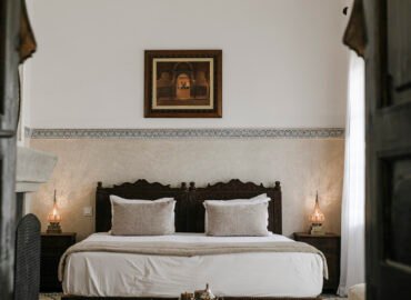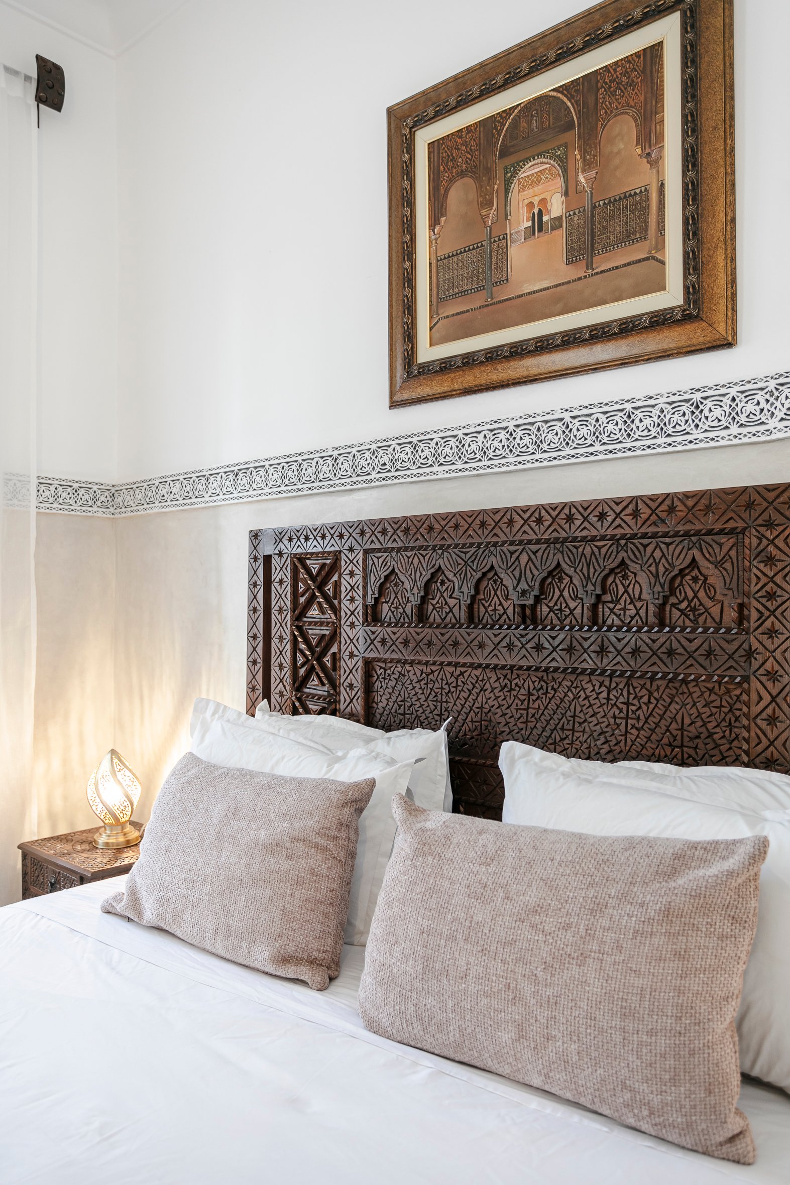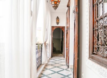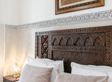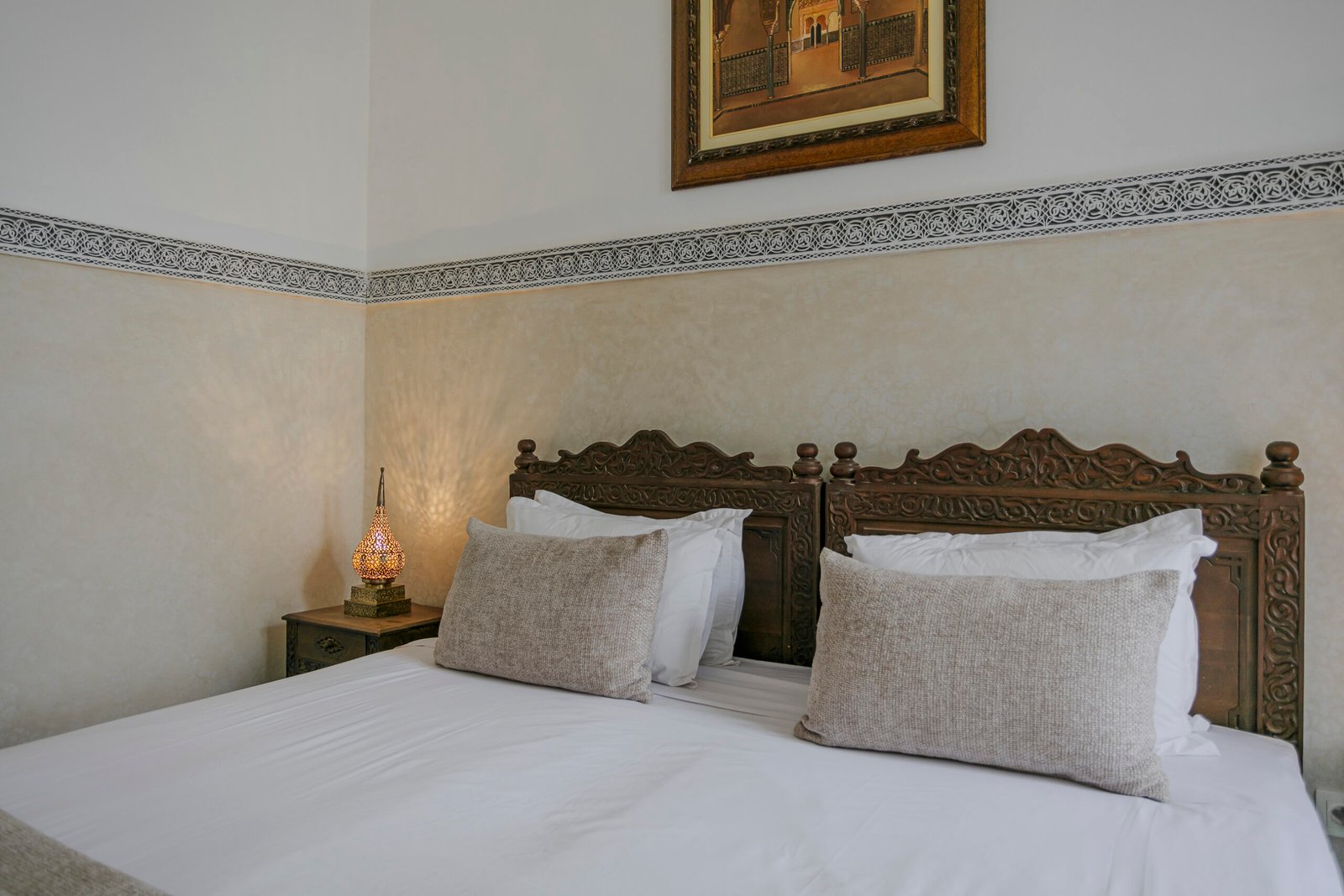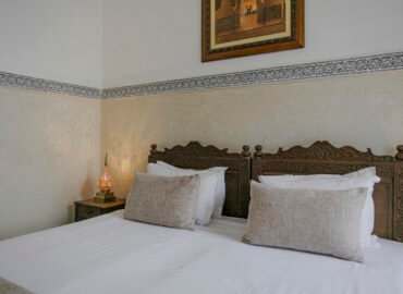 grâce à leurs grandes ouvertures vitrées et leurs portes Roja traditionnelles, elles offrent une vue apaisante sur le patio et son bassin arboré, véritable cœur du riad. Chaque suite révèle une atmosphère chaleureuse et raffinée, où se mêlent zelliges délicats, marbre poli et bois de cèdre sculpté à la main. Le mobilier artisanal et les objets d’art ancien créent un cadre intime et authentique, propice à la détente et à la contemplation.