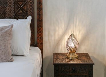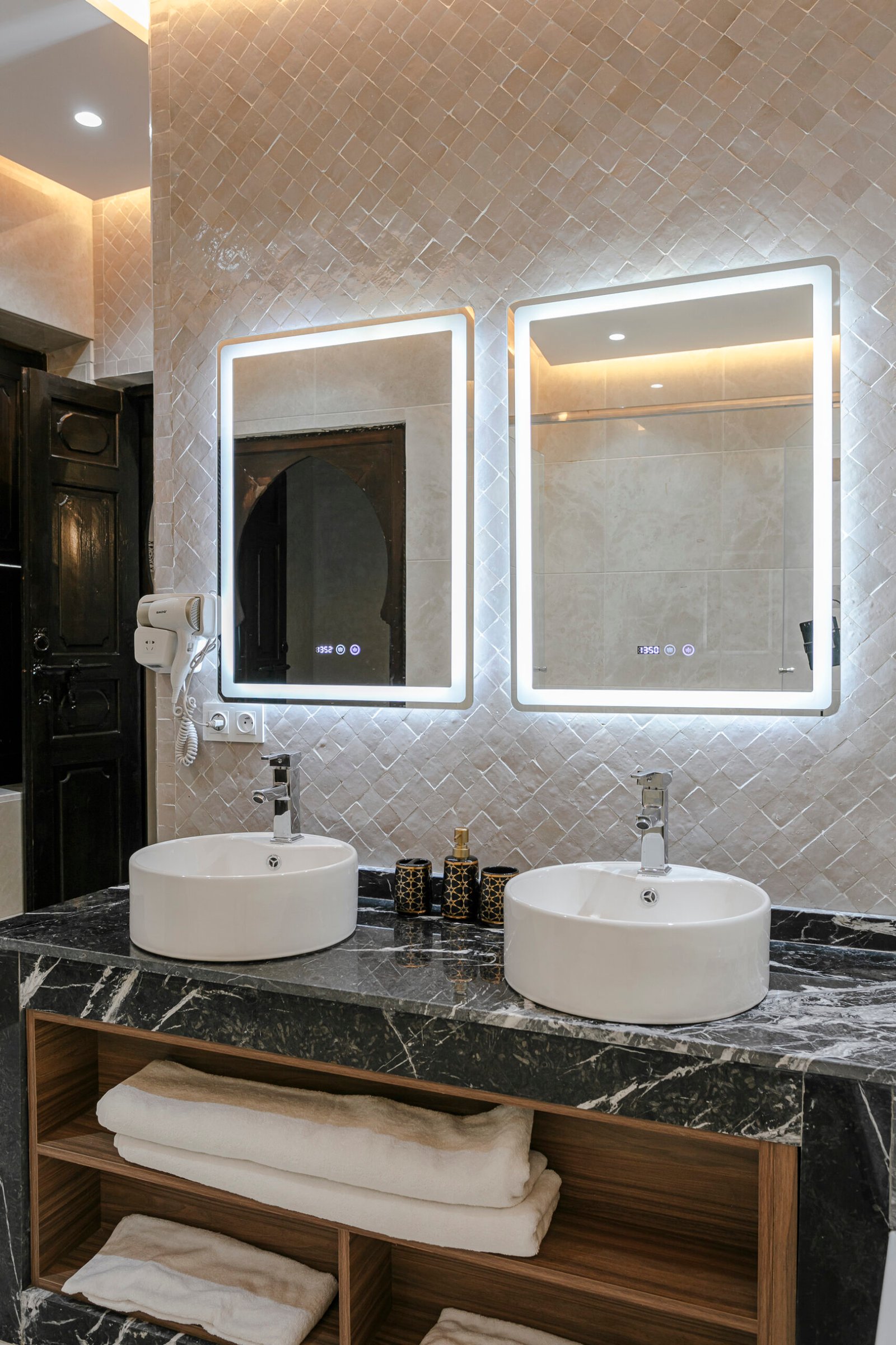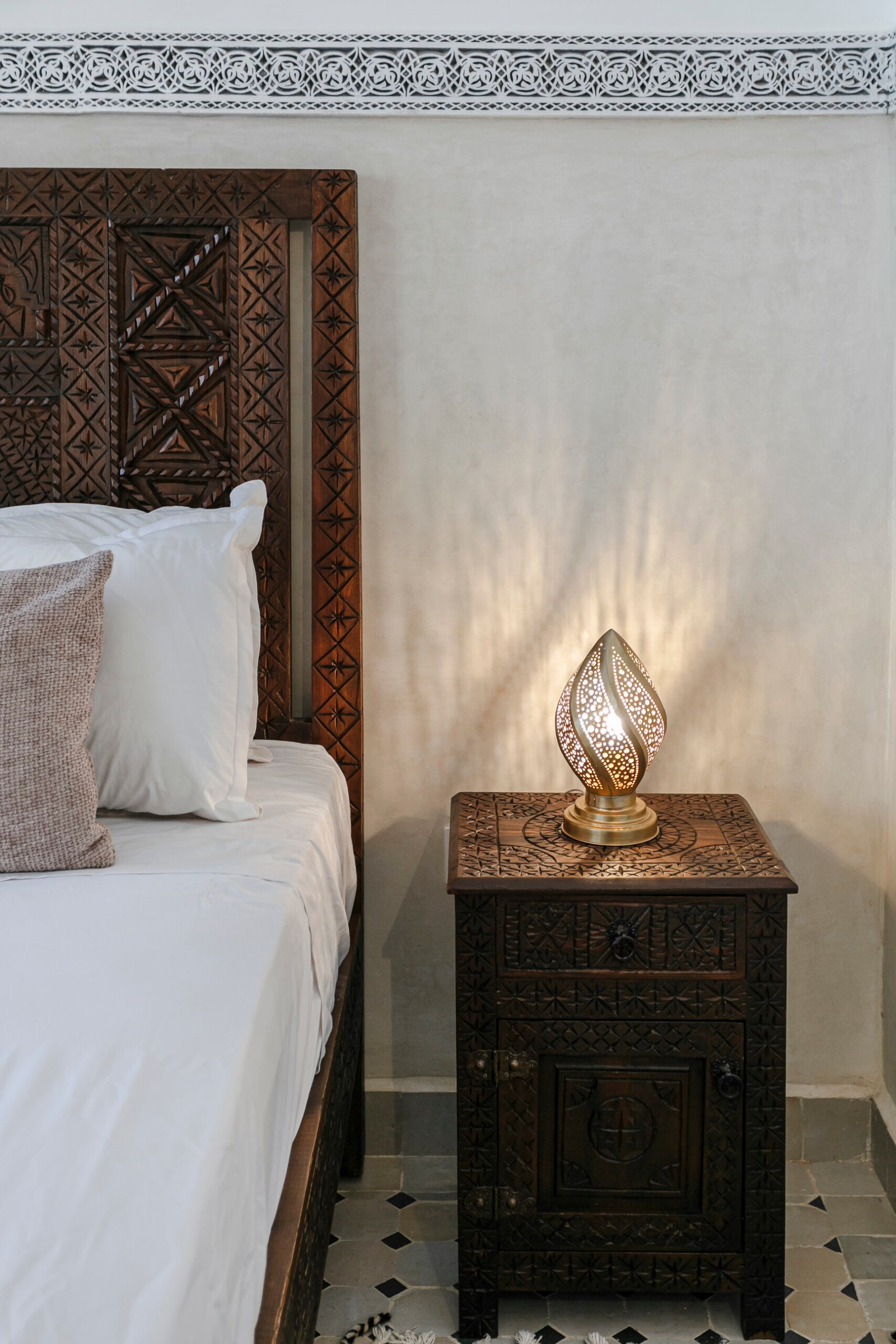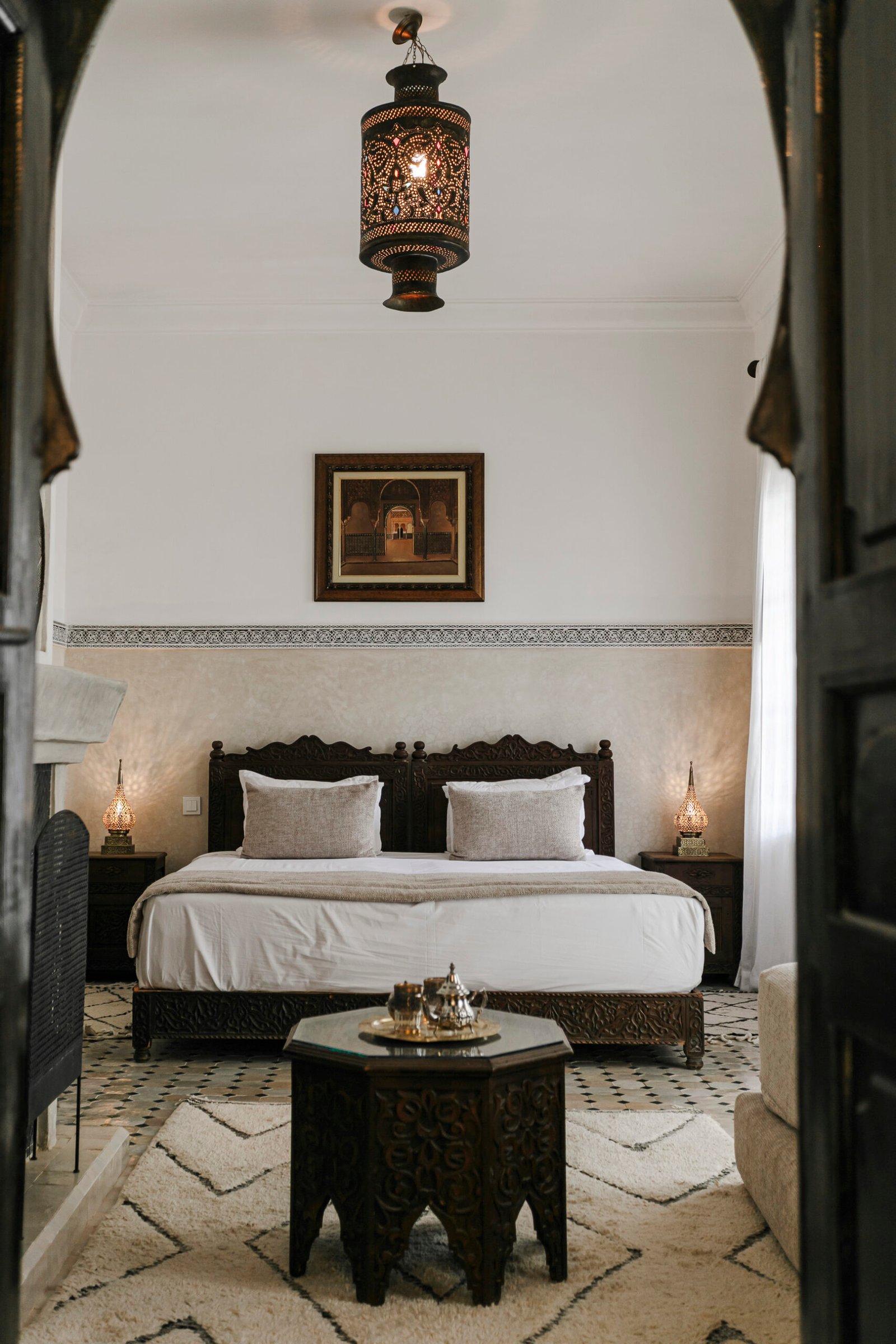grâce à leurs grandes ouvertures vitrées et leurs portes Roja traditionnelles, elles offrent une vue apaisante sur le patio et son bassin arboré, véritable cœur du riad. Chaque suite révèle une atmosphère chaleureuse et raffinée, où se mêlent zelliges délicats, marbre poli et bois de cèdre sculpté à la main. Le mobilier artisanal et les objets d’art ancien créent un cadre intime et authentique, propice à la détente et à la contemplation.